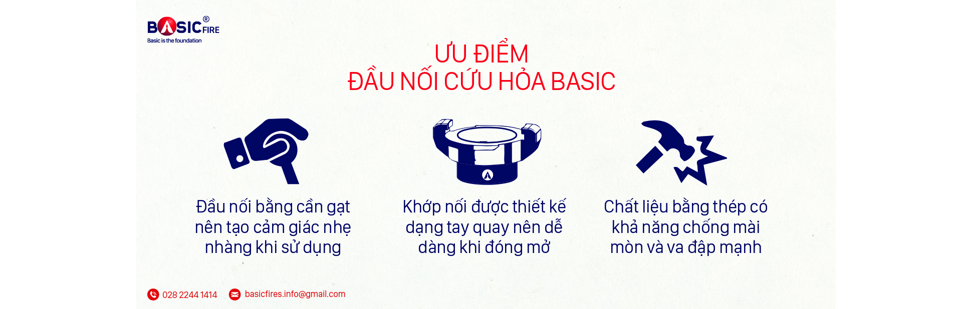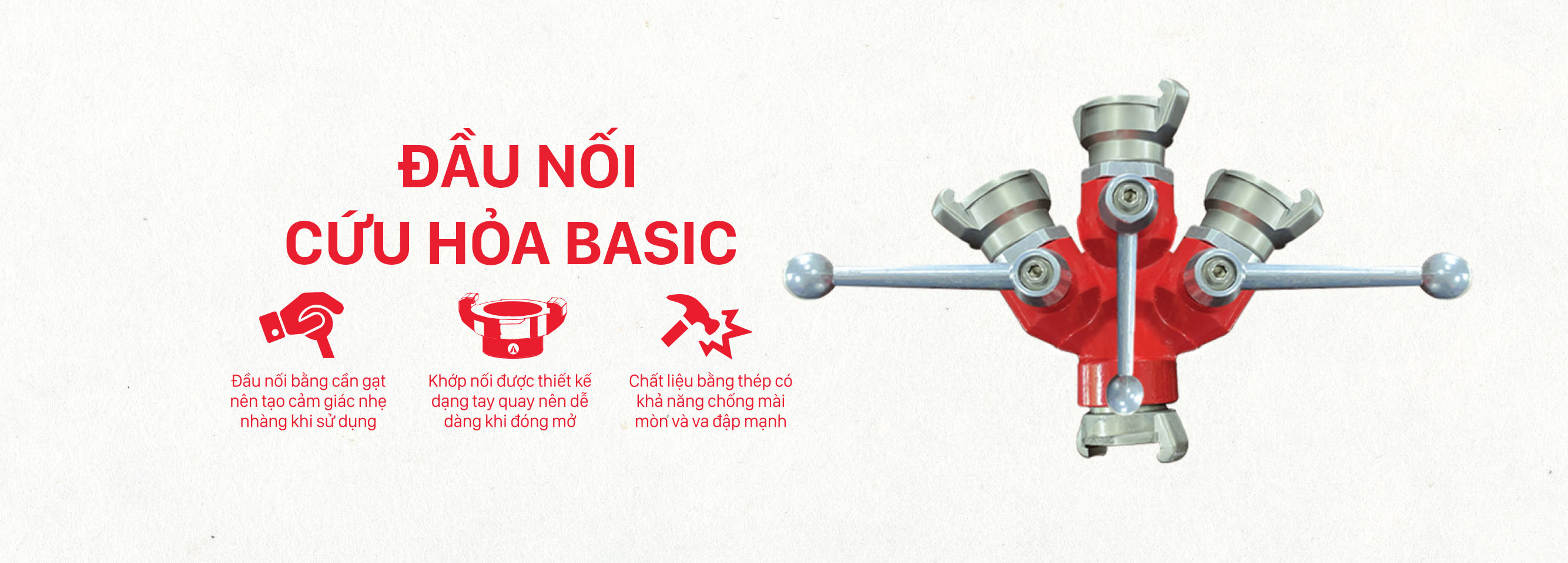 - Firefighting connector works based on the principle of push and pull (Push and Pull). When the male end (Adaptor) connects to the female end (Coupler), the two ends are designed to lock themselves together precisely to prevent leakage. To disconnect, simply pull back the handle on the top of the Coupler, we disassemble the pipe quickly.