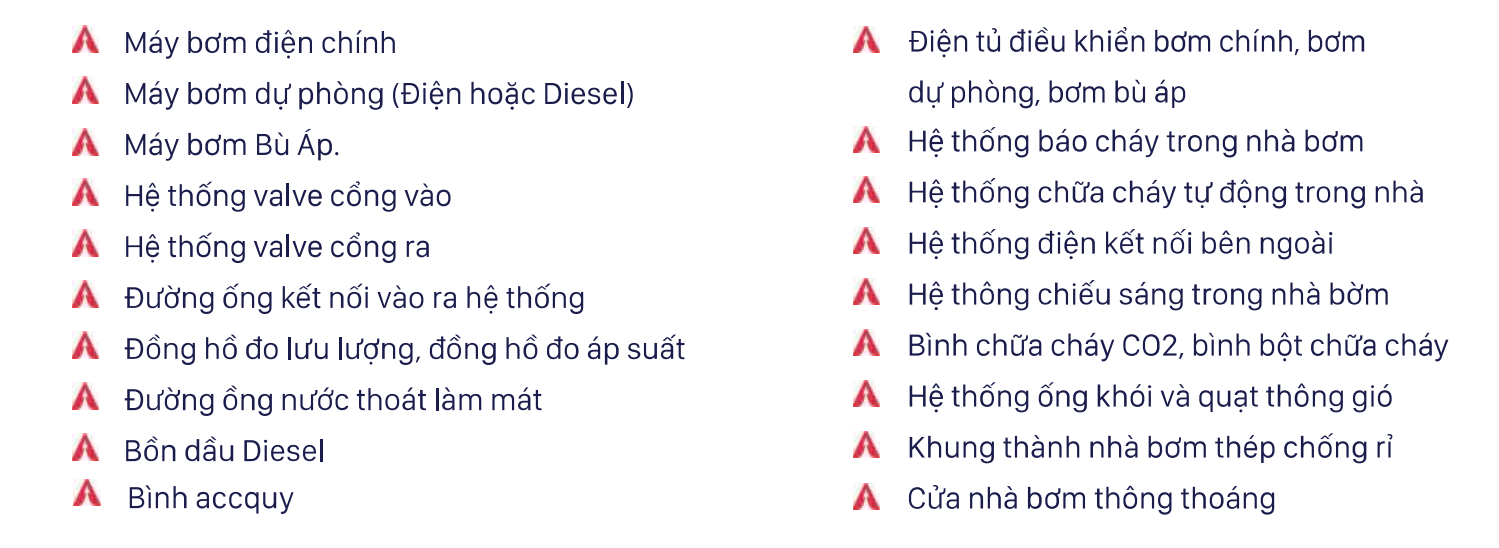 - Tổ hợp máy bơm phòng cháy chữa cháy với tính năng cung cấp nước chữa cháy cho hệ thống một cách ổn định đúng với thông số kỹ thuật thiết kế.